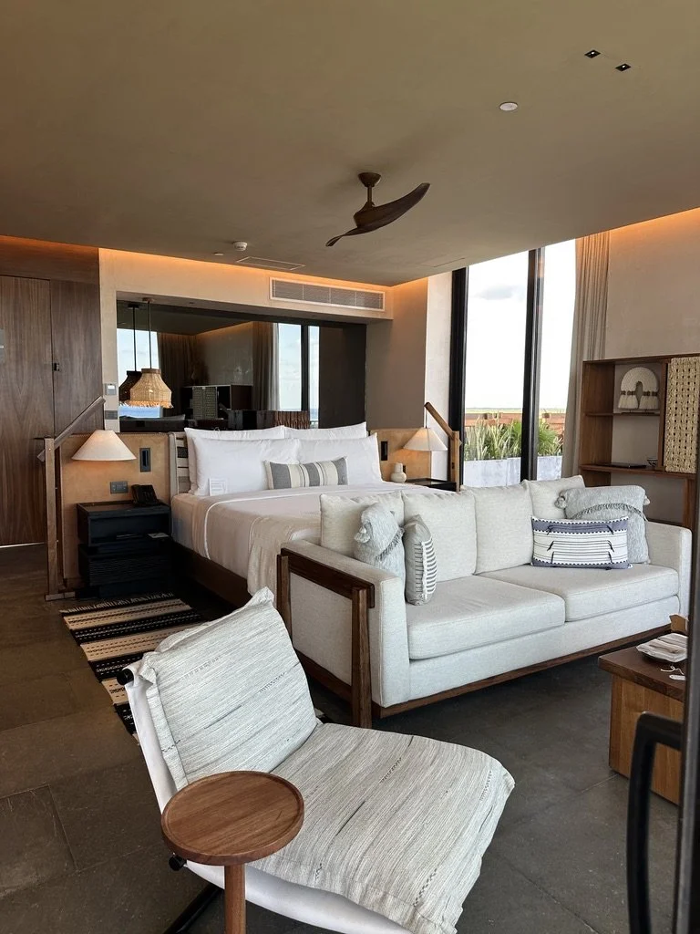 Our room was calming in the best way — wooden closets, arched doorways, neutral tones, and a view of the ocean that made waking up feel like a small luxury. The bed was comfortable, the bathroom was thoughtfully designed, and the kind of energy that made you want to just settle in for a long while.